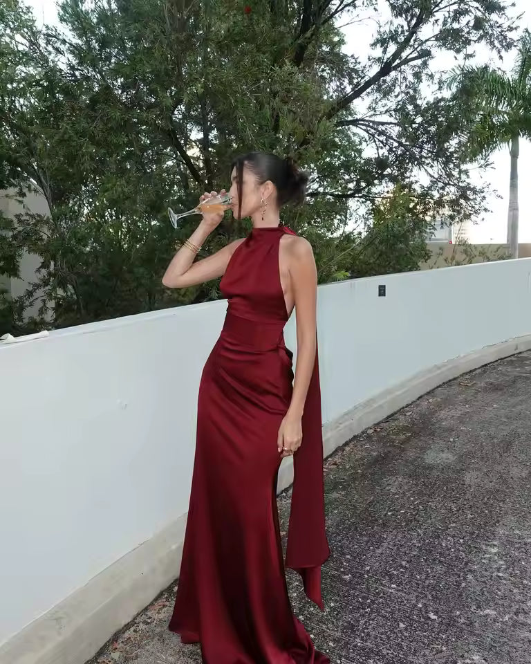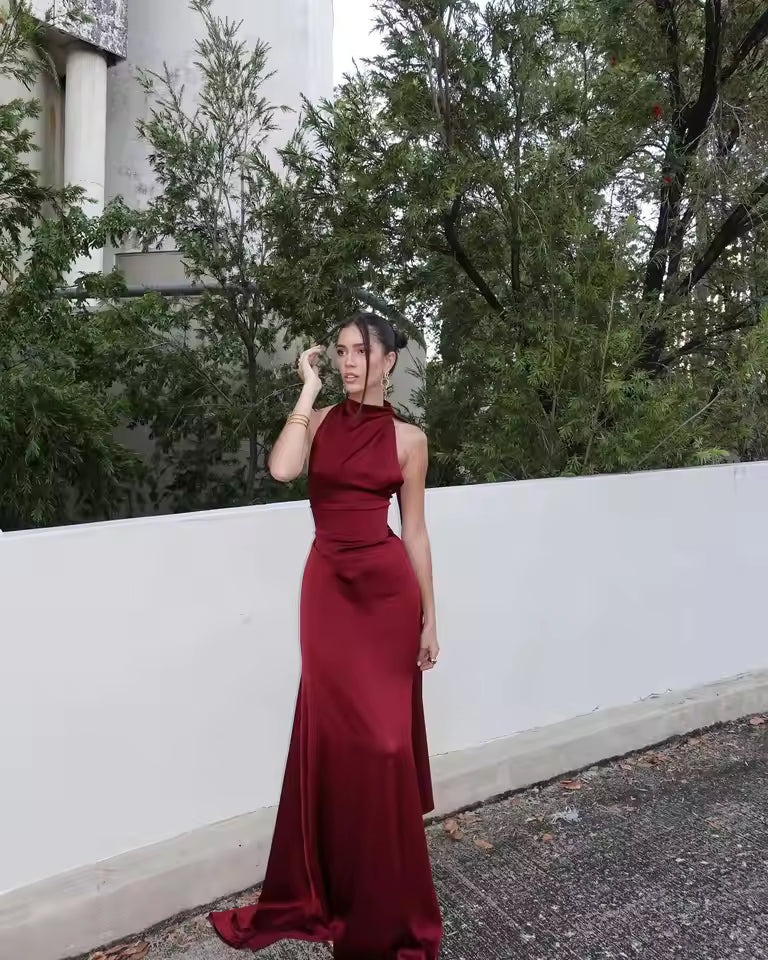 Realizzato in satin morbido e luminoso, questo abito lungo bordeaux cattura la luce con eleganza. Il tessuto scivola delicatamente sulla silhouette, creando un effetto sofisticato e femminile.